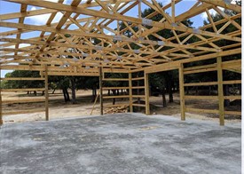 On site a Post Frame building’s main frame is typically connected using steel fastenings and plates. Many connections need to be cut and assembled on site.