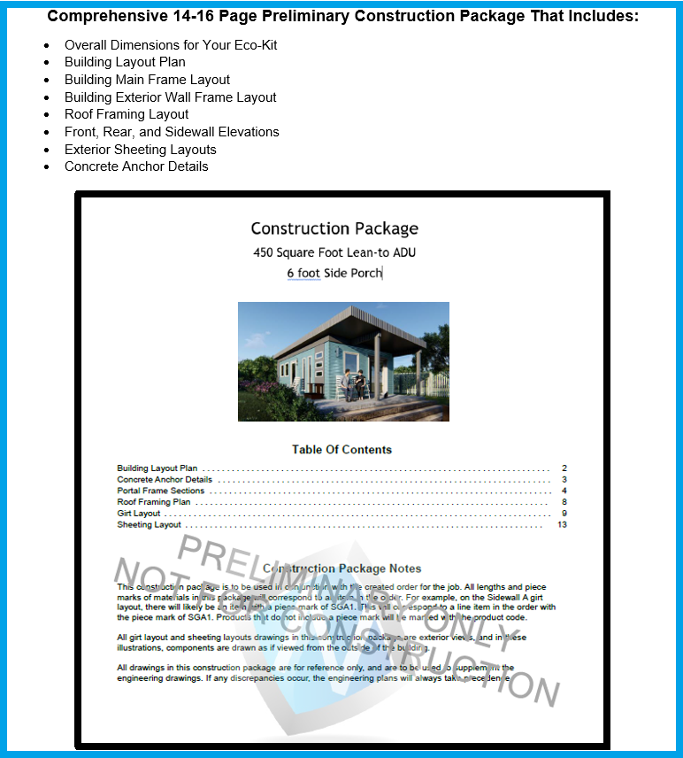 We Will Design Each and Every Eco-Kit Preliminary Plan Review Packet for Our Clients Exact Property Location and Requirements.